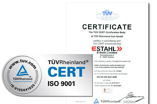 Im Jahr 2007 entschlossen wir uns zur Zertifizierung nach DIN ISO9001 durch den TÜV Rheinland. E-stahl ist eines von den ersten der Branche, dass nach nur wenigen Monaten nach DIN ISO9001 zertifiziert wurde. Bis heute ist die Qualität eines der obersten Prioritäten des Unternehmens.